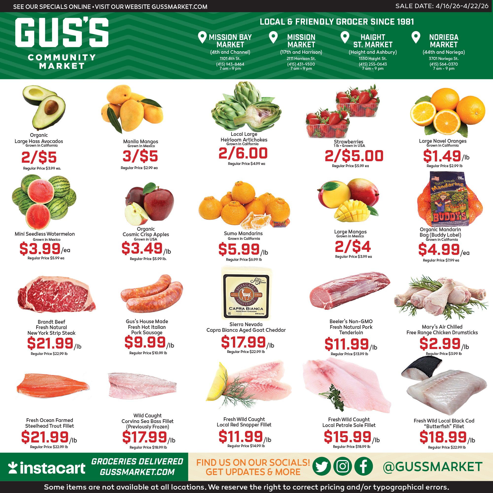 Gus'S Community Market Sale Flyer Featuring Discounted Produce, Meats, Cheeses, And Other Groceries With Prices, Colorful Images, And Store Locations. Sale Dates: 4/16/20–4/22/20. Instacart Delivery Info At The Bottom.